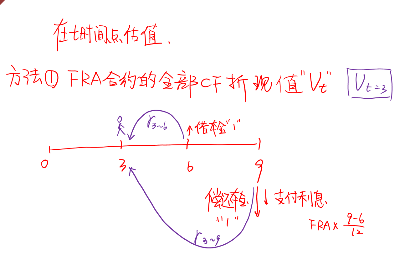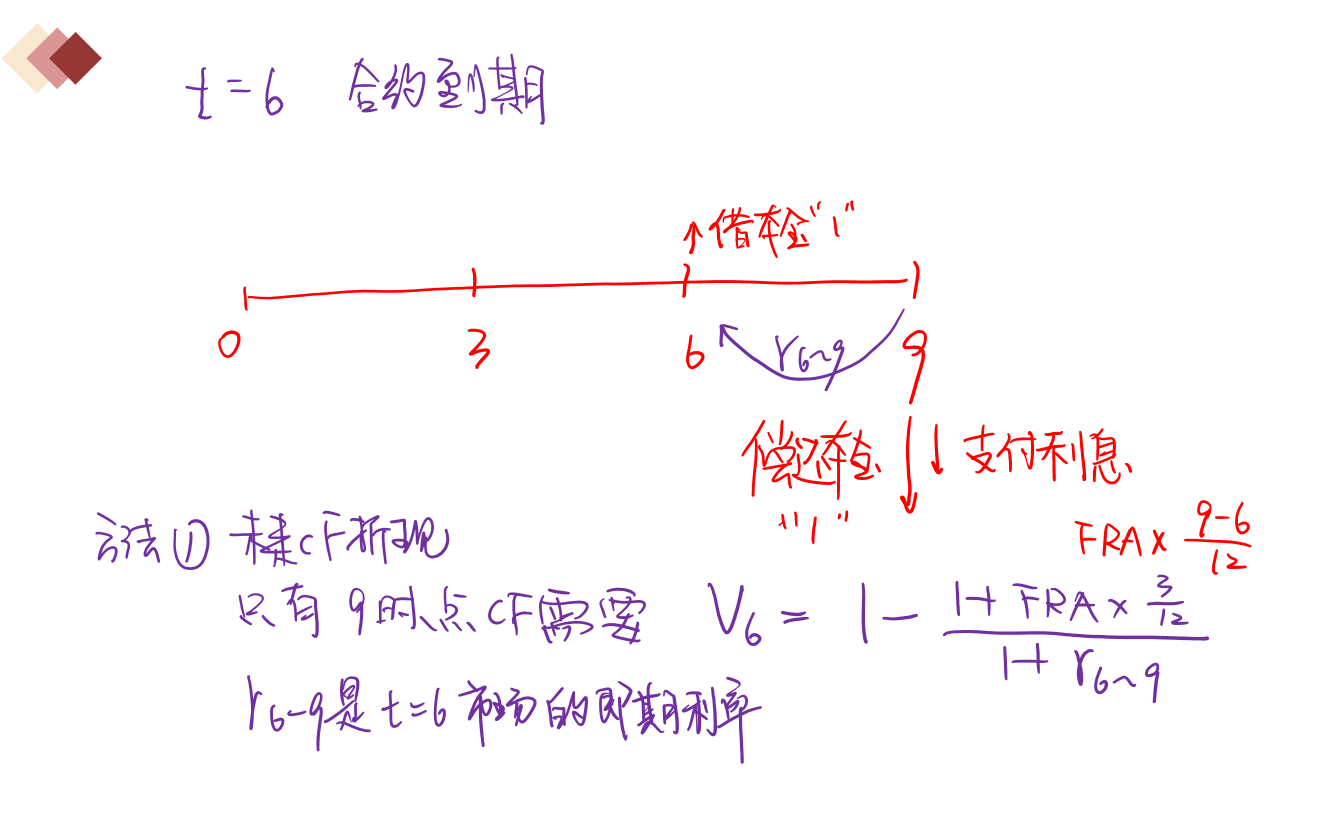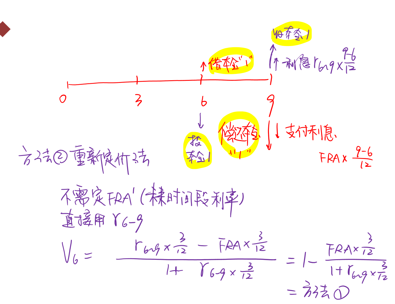 老师您好,我稍微梳理了一下思路,您给的这个方法是把6时点收的1 本金折回3时点这一步与at expiration不同对吧(at expiration直接收1本金不需要折现)?然后解析中的方法是,在3时点重新算一遍FRA的价格,与0时点FRA价格相减再折现到3时点;如果是at expiration,则用6-9的MRR与0时点的FRA相减再折现到6时点。其中,分子的期限永远与借款期限一致,分母期限根据折现时点而定。请指正