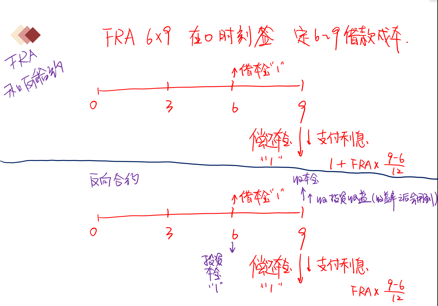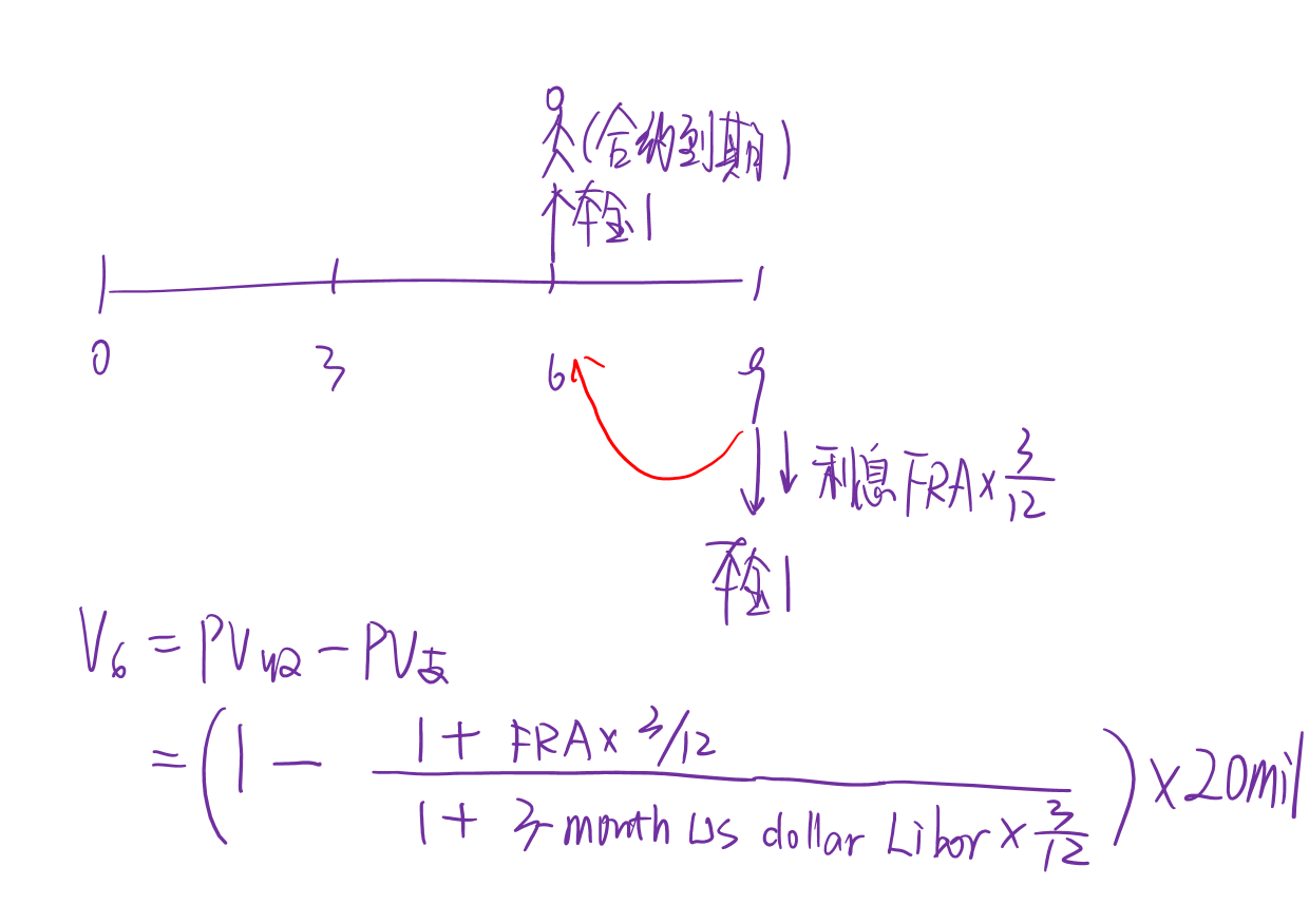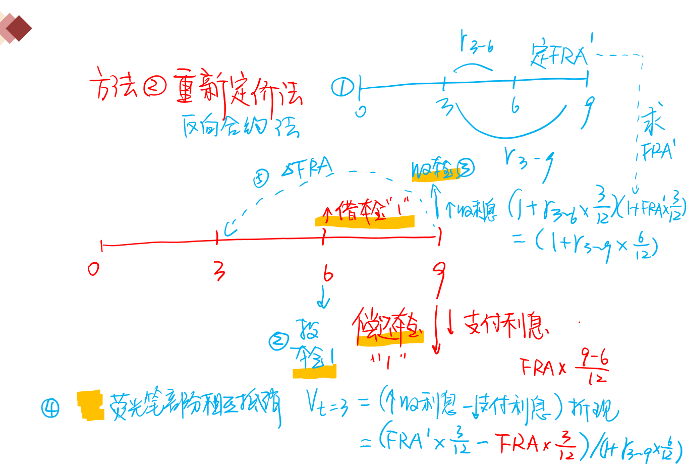 老师您好,我稍微梳理了一下思路,您给的这个方法是把6时点收的1 本金折回3时点这一步与at expiration不同对吧(at expiration直接收1本金不需要折现)?然后解析中的方法是,在3时点重新算一遍FRA的价格,与0时点FRA价格相减再折现到3时点;如果是at expiration,则用6-9的MRR与0时点的FRA相减再折现到6时点。其中,分子的期限永远与借款期限一致,分母期限根据折现时点而定。请指正