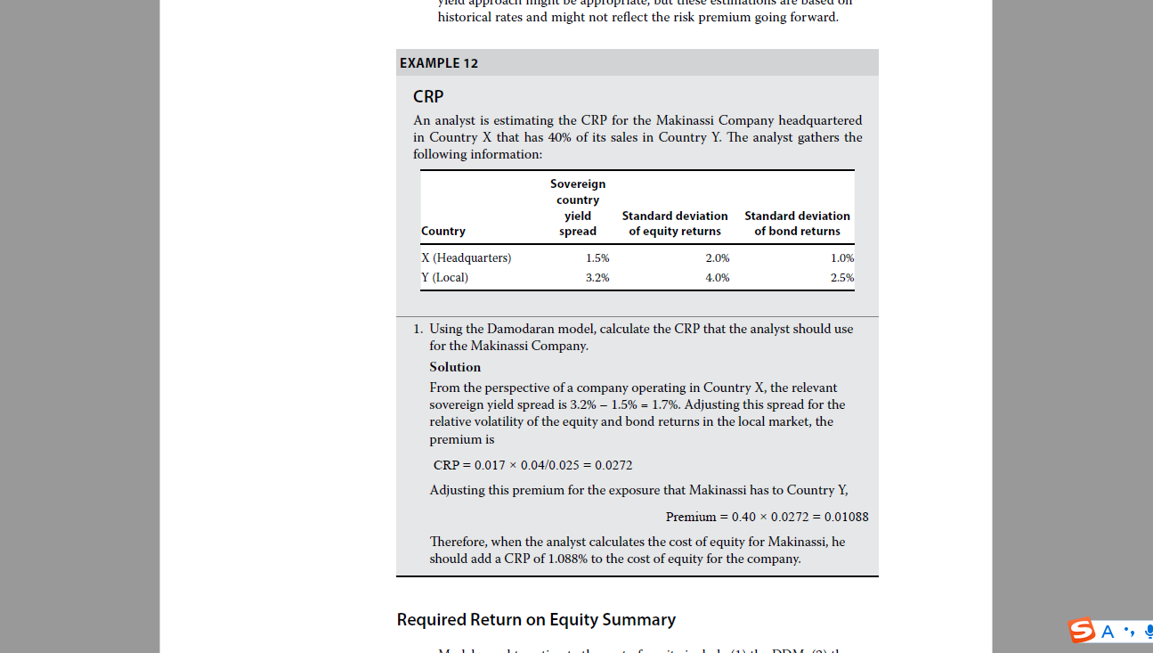 关于第4题CRP的计算 公式是 ERP=ERPdeveloped+λ*CRP,CRP=sovereign yield spread*(σequity/σbond)=3.38%,这里都没有问题,既然题目是问“the CRP that the analyst should use...would be”,就是在问CRP啊,而题目解答里说答案是3.38%*35%=1.18%也就是λ*CRP,题目问的是CRP是多少,答案解答回答的其实是λ*CRP是多少