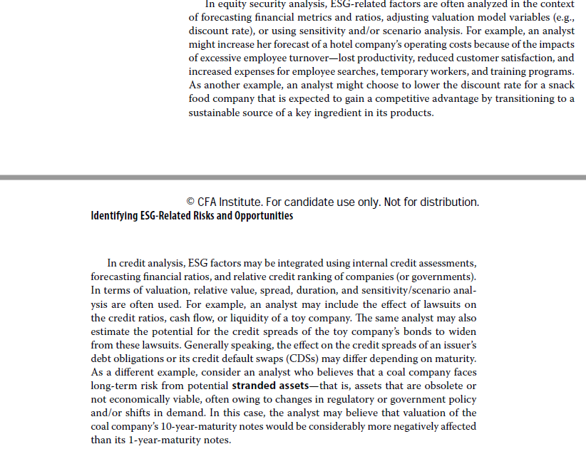 在权益证券分析中,通常用ESG识别潜在机会,减少下行风险。用ESG预测财务比率,调整模型变量(比如这道题说的调整折现率)。而债券分析中,主要用于识别下行风险。方法包括内部信用评级,预测财务比率和信用评级。通常用于测定相对价值、价差、久期。