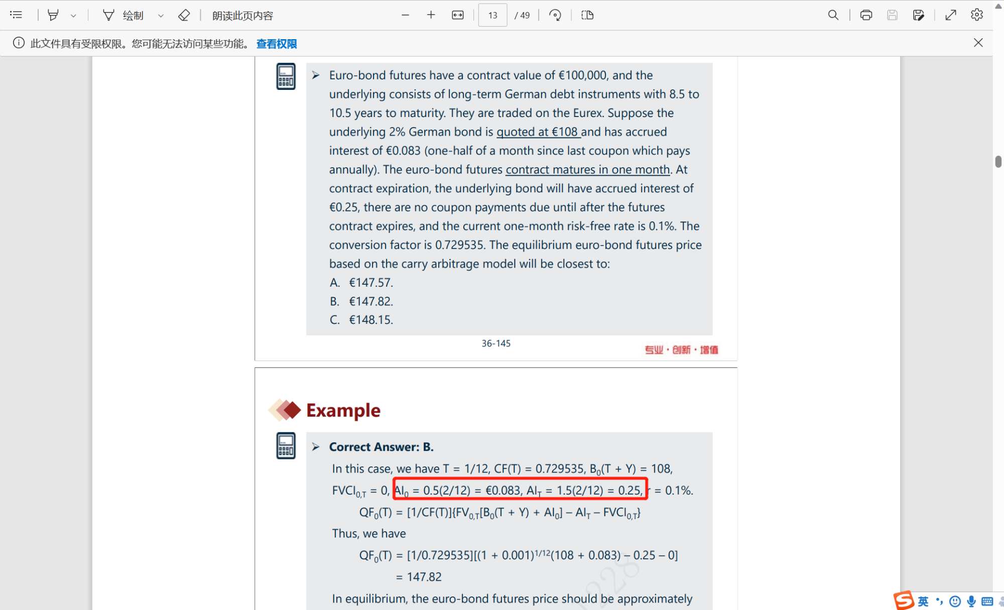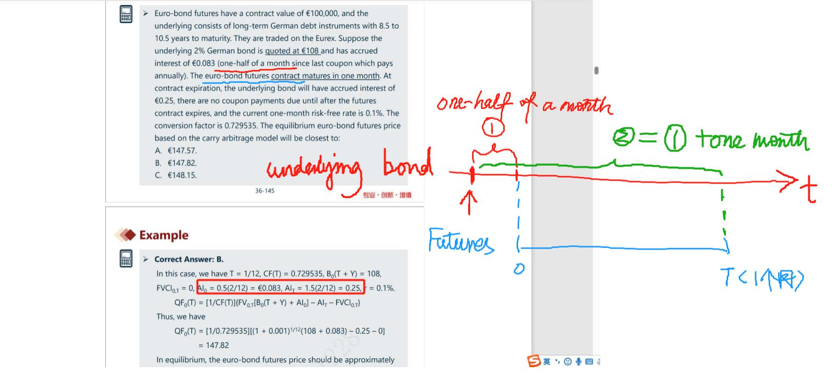 有题目可知,期货合约还有一个月到期,那么期初的应计利息AI0是多少,要找到最近一个发coupon的日子,题目说半个月之前,那么AI0就是①时间段累计的coupon,2%x100=2是一年的coupon,半个月的coupon就是2x1/12x0.5=0.083