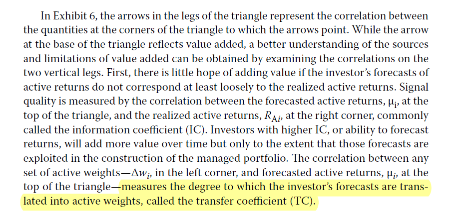 同学,下午好。因为TC衡量的是把预测主动收益μ变成主动权重△w的能力,TC是预测收益μ和主动权重△w之间的相关系数。而在公式里,我们就拿(μ/σ,△w×σ)这两项的相关系数来表示TC,如果(μ/σ)和(△w×σ)相乘,σ就能约掉,剩下的就是μ和△w。