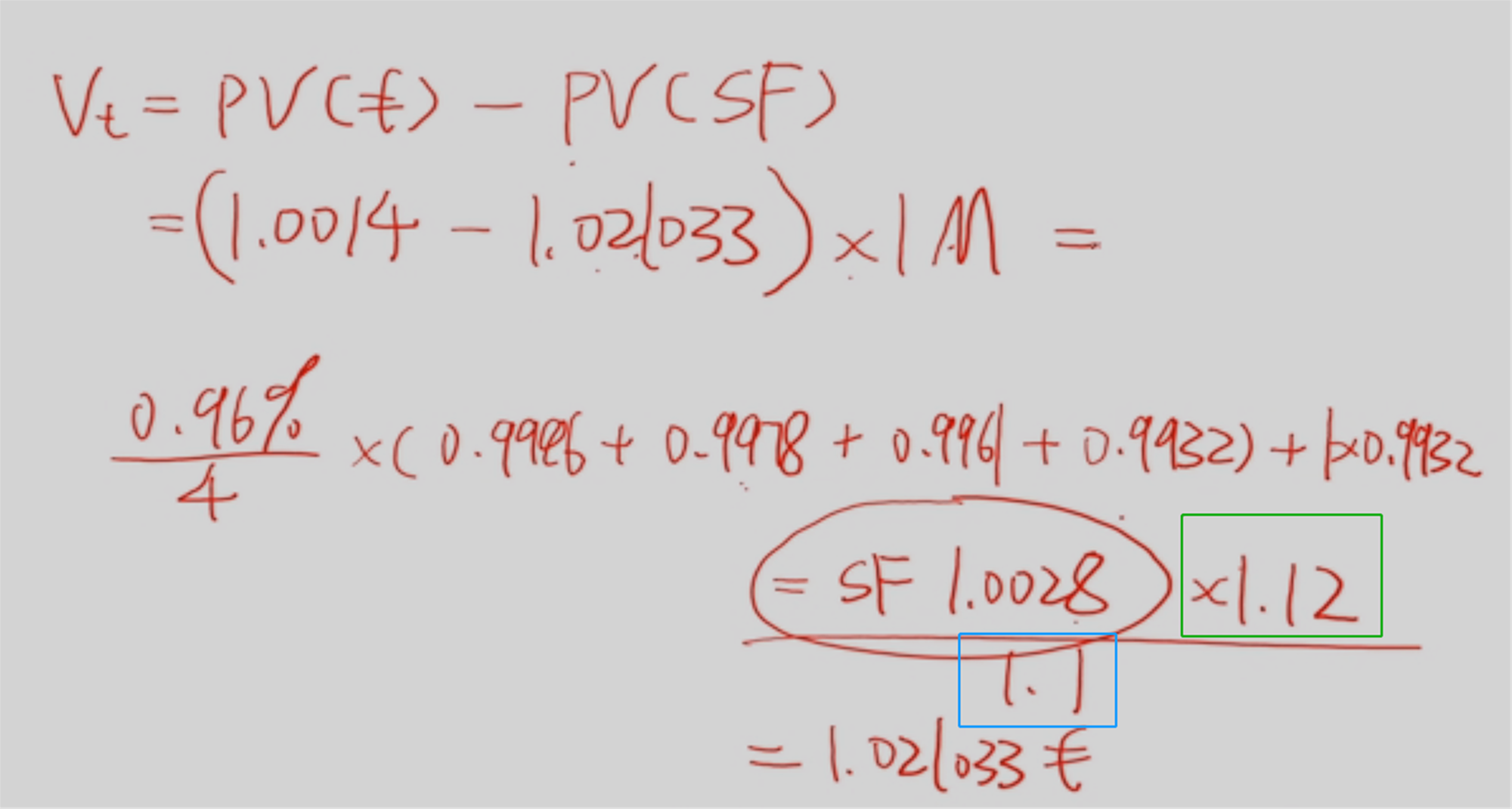 【回复】1.0028的单位是SF。期初按照1.12的汇率要计算SF的本金,期末需要用1.1的汇率将SF的现值从SF转€。