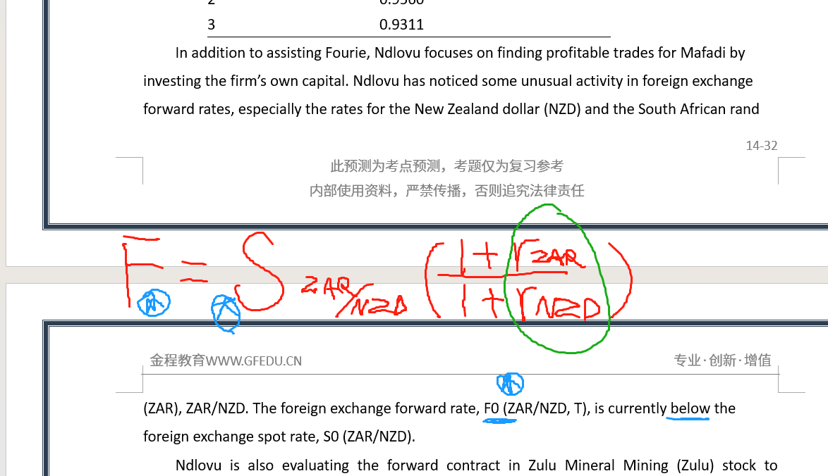 这个题目考的是远期合约(标的资产是汇率)定价公式,如下图所示,已知条件是蓝色的“大小关系”,需要判断的是绿色两个利率的大小关系