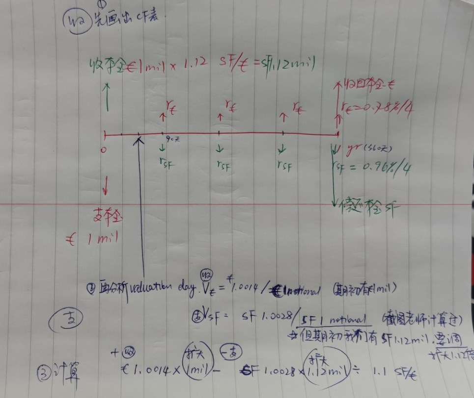 ☆关键在于老师和我们求出来的这个“1.0028”的前提条件是:SF的本金是单位1,如果用题目的套路表述,则是:"SF1.0028 per SF1 Notional",基于这点我们期初本金是1.12mil的SF,于是要扩大1.12mil倍数。另外的€本金需要将1.0014扩大1mil倍