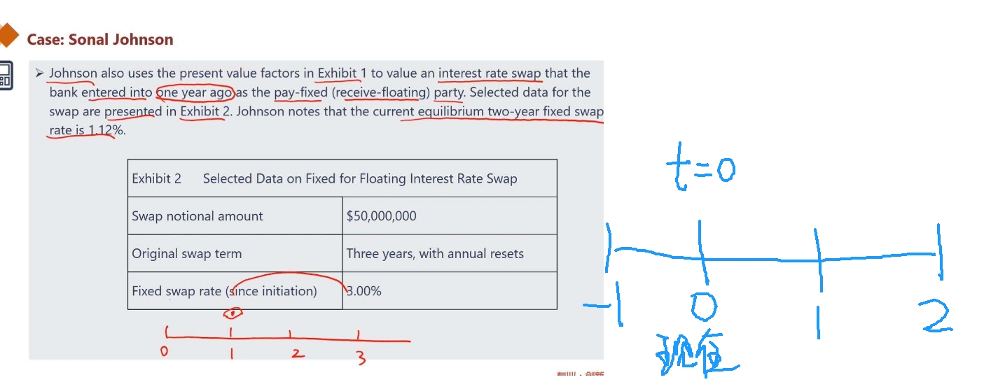 老师好!请问衍生课后题第二题第二问里,一个三年的swap,bank“......enter into one year ago as the pay-fixed ( received floating) party”,这里我搞不清楚小t的时间点,bank一年前进入这个合约,小t从t=1开始,我咋搞不明白这个时间点,我怎么感觉小t是从-1开始。弄不清楚,请老师讲一下,谢谢!