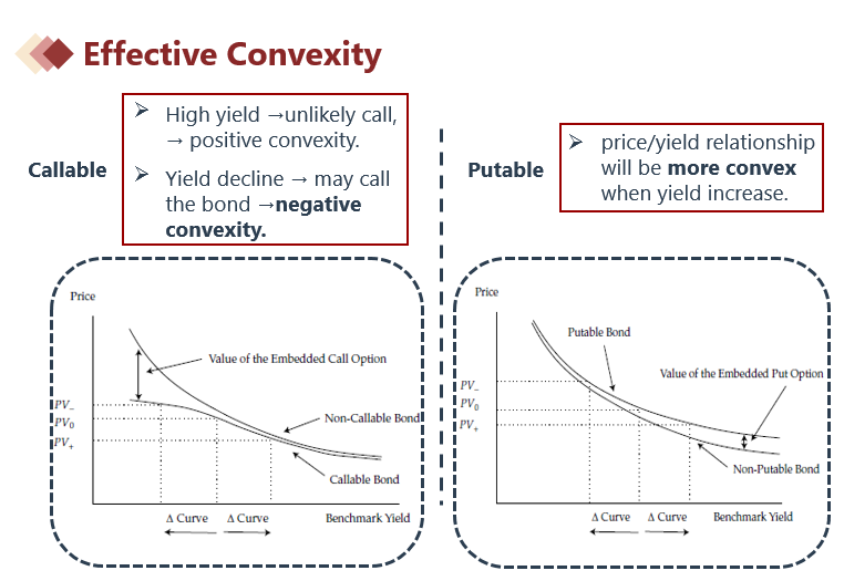 而putable bond它整体的曲线更弯曲了,所以是more convex。这个内容在一级里面学习过见下图