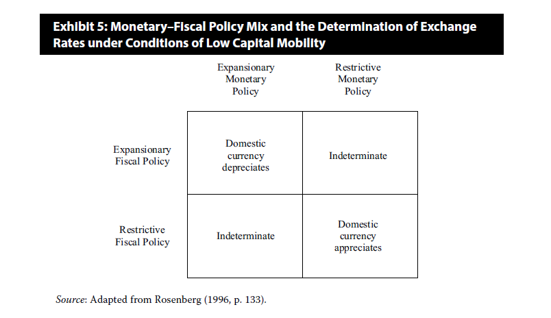 对于经常账户, 一 国紧缩的财政政策会减少该国的总需求,从而进口减少,贸易交易对外币的需求减少,外币贬值,本币升值。