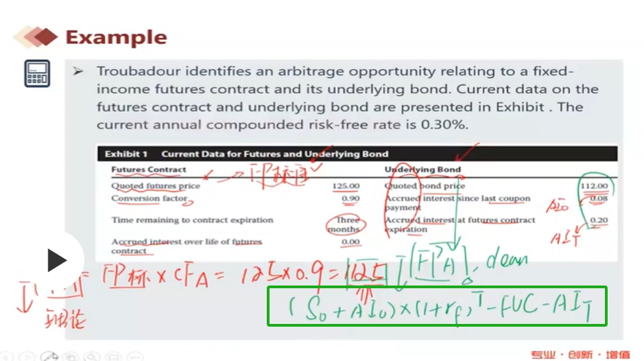 截图中quoted futures price指的是现在签订一份期货合约,标的资产是截图中的债券,约定在T时刻交易标的资产时报价“标准国债期货”clean price,它乘以转换因子就是期货合约对应的标的资产自身在T时刻的净价