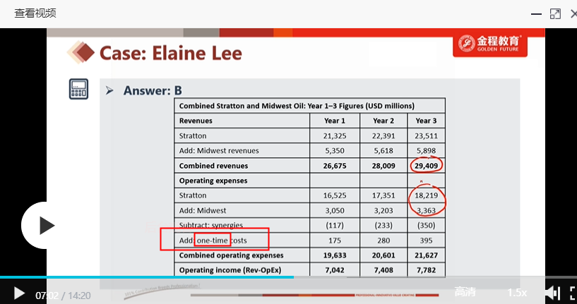 是不明白为什么那是一次性的费用??题干中并没有提到这个one time cost…………咋来的一次性??也没说清楚啊。既然350万的协同成本降低是以后都存在的,为啥395就不一直存在了?题干没有明说,是一次性啊。