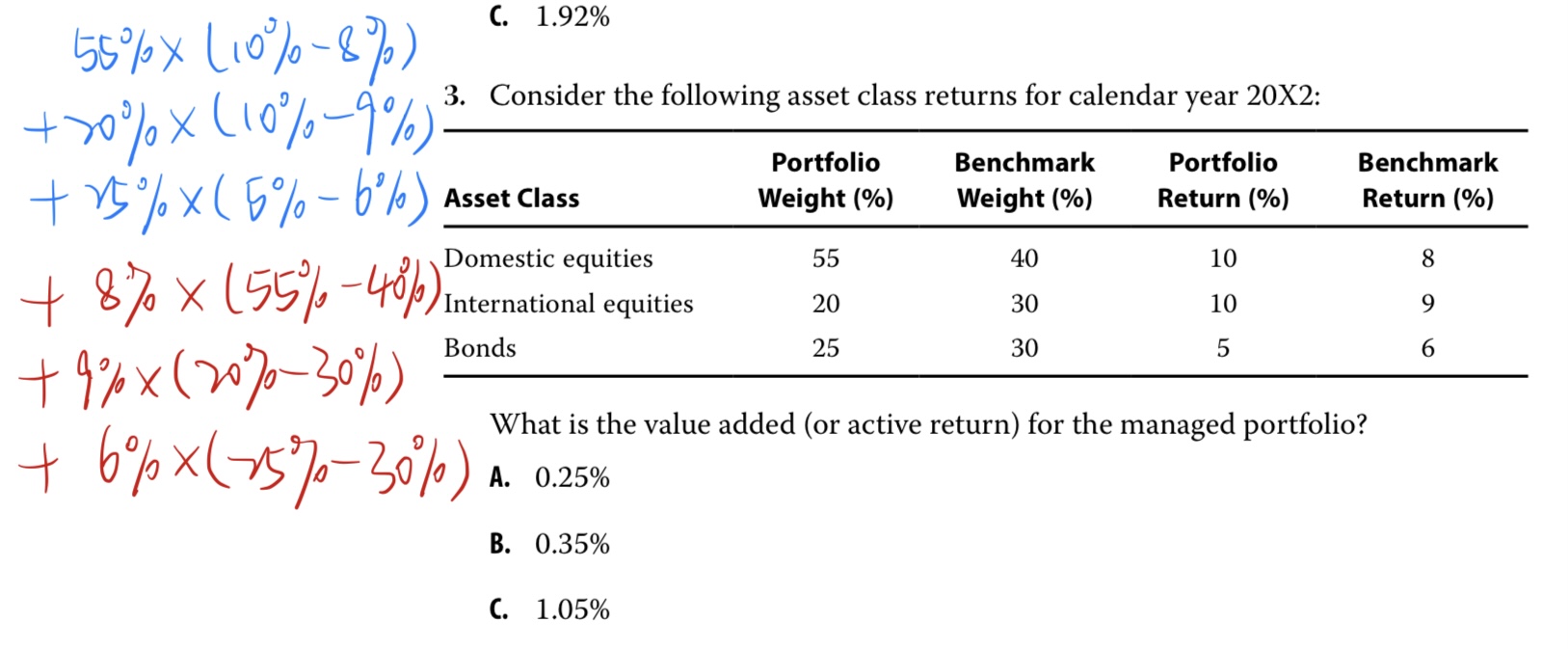 如果这道题一定要用另一种方法做,可以将value added分解为两部分,具体步骤见下图。蓝色笔是Security Selection,红色笔是Asset Allocation。