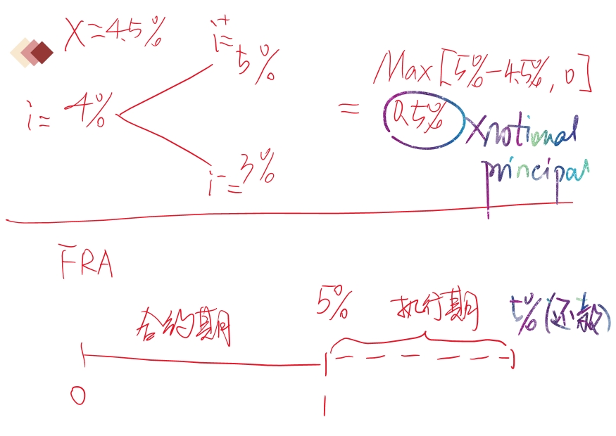 利率期权,直接将利率作为普通标的资产,i+=5%就是当下时间点的数值,大于执行价格4%,那么此时的payoff=5%-4.5%=0.5%,然后乘以名义本金notional principal