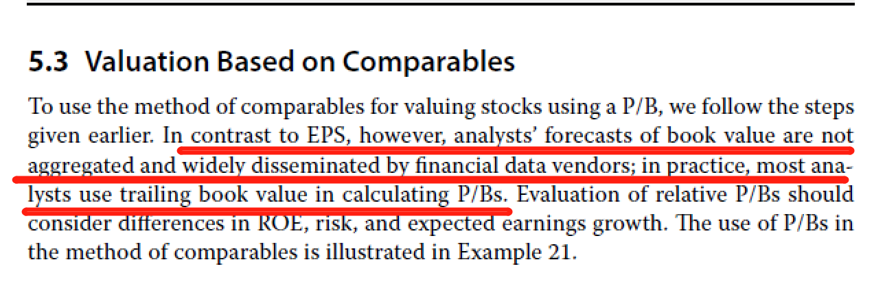 同学你好,一般来说P/B 都是trailing的,因为实务上分析师都用最近一期的book value,也就是B0,分析预测的book value也通常不会包含在数据库中,因此无特别说明,P/B就是P0/B0。