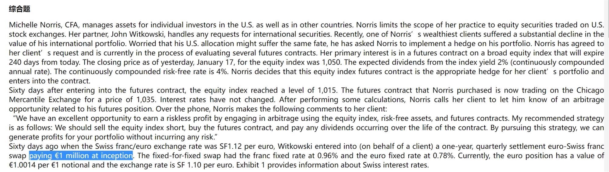 第六题,题目Witkowski entered into (on behalf of a client) a one-year, quarterly settlement euro-Swiss franc swap paying €1 million at inception,不是付欧元么?老师为什么说是收欧元付瑞郎呢?