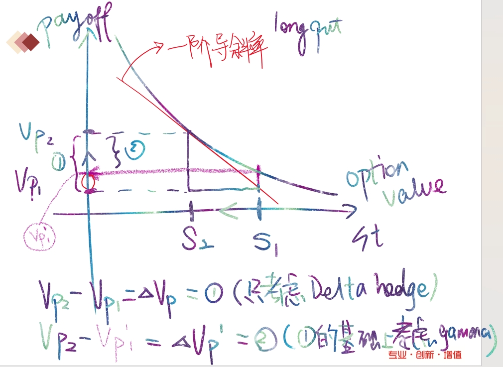 题目的最后一段说Lee采用long put来对冲标的资产价格较大波动带来的影响,达成的状态是delta neutral,但是在delta这个一阶导带来的影响之外还需要考虑二阶导gamma。可以参考以下截图理解