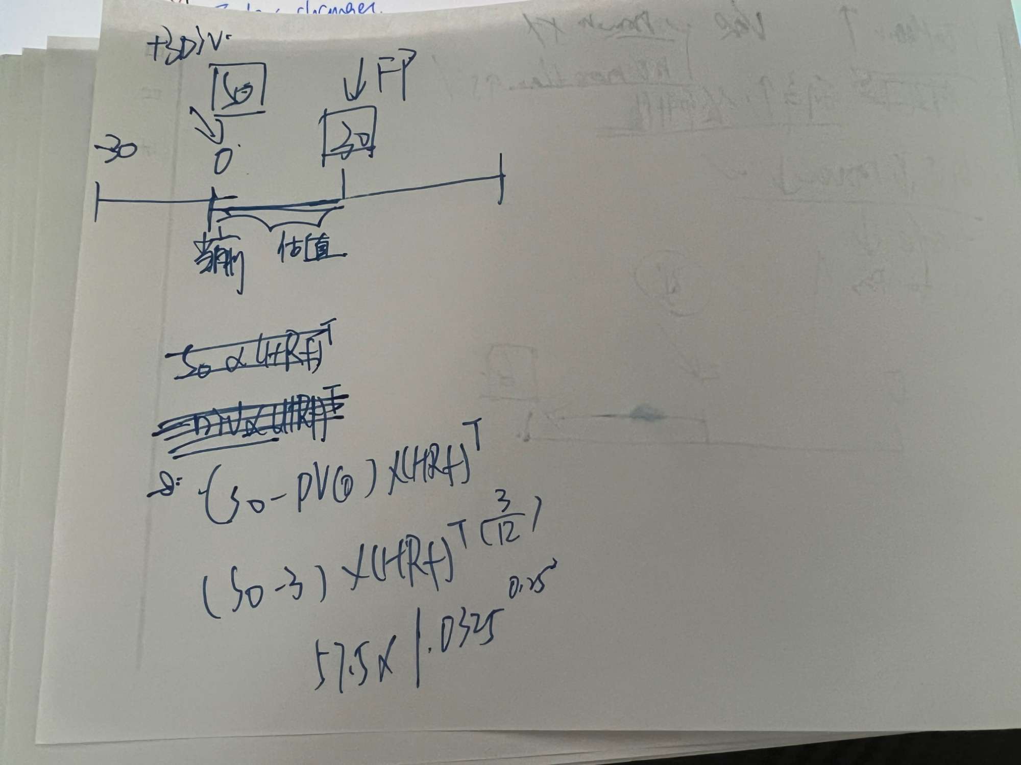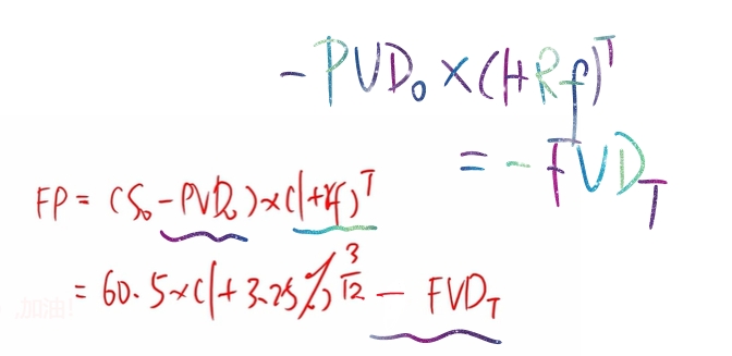 第5小题是对3个月之后的标的资产交易价格进行定价,而股票股利正好发生在未来的3个月之后的这个时间点(以下截图2绿色横线),于是有以下截图1的关系,股利不用折现,因为股利这笔现金流和FP定价定出来的现金流所处时间点相同都是T时刻