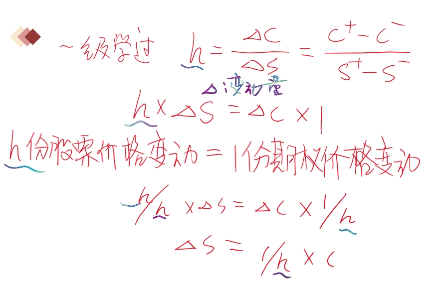 作为系数可以使得达到我们的目的“hedge”,如下截图辅助理解,我们的目的是股票和期权总体的价值不变→做到hedge,那么股票和期权的价值变动相互抵消即可