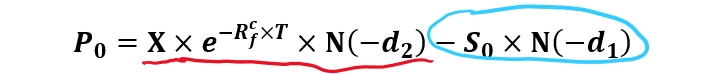 3.put 里面没有delta,put里面是N(-d1)。对于“负”可以理解为put通过“卖出股票去投资债券”,结合以下截图,红色部分是正的(投资债券),蓝色部分是负的(卖出股票)