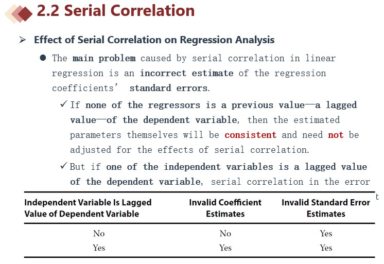 同学你好。如下图,在序列相关性中,如果自变量是因变量的滞后项,此时会影响估计的有效性。
