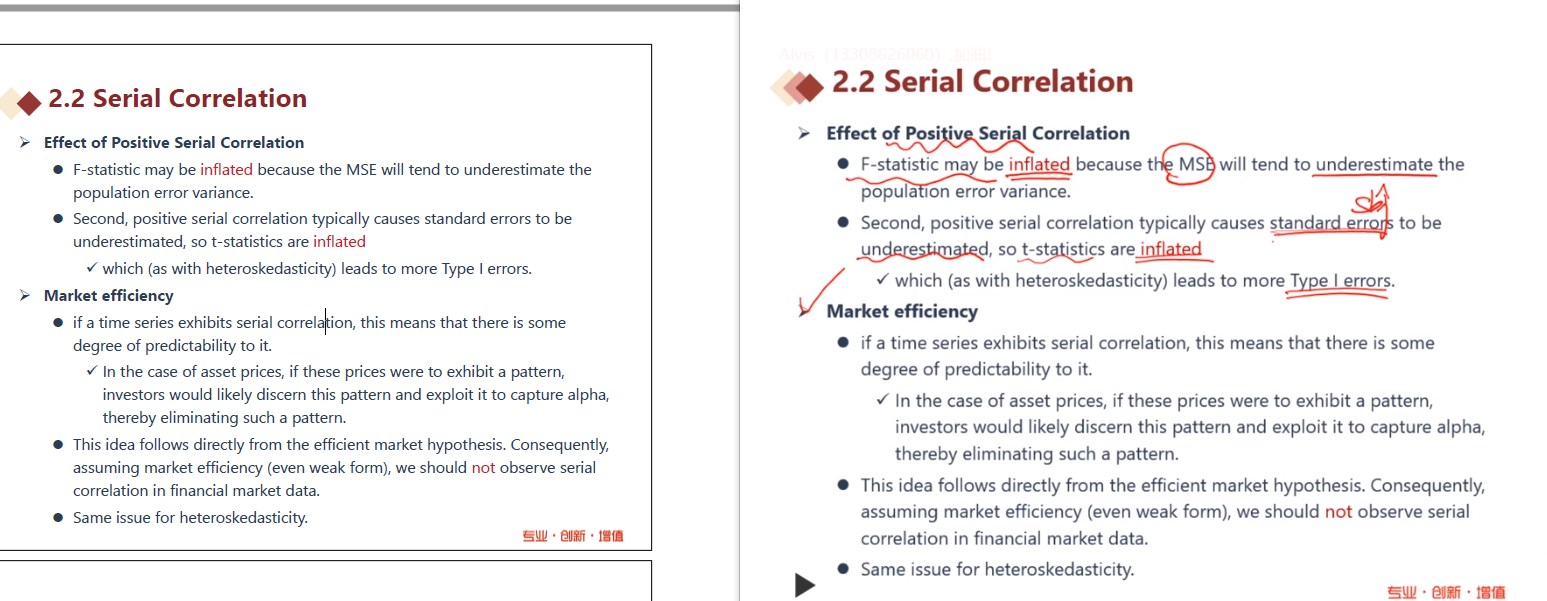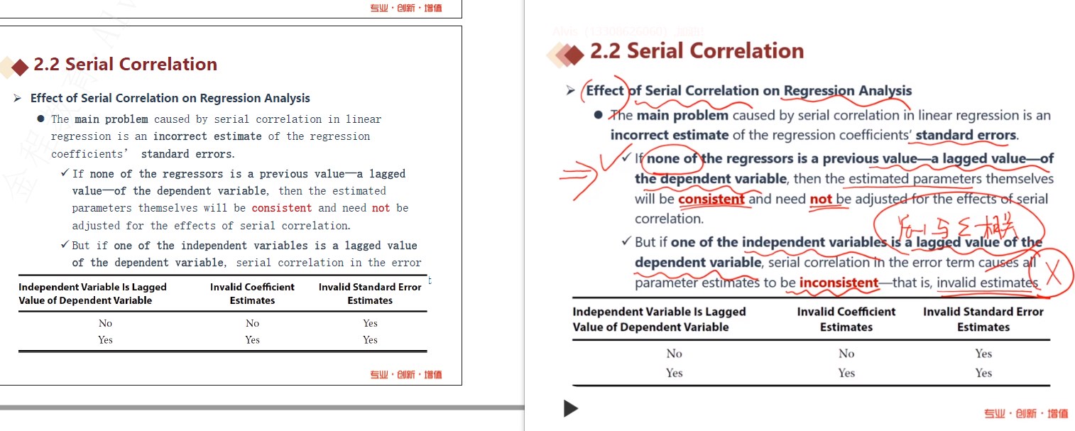 数量对应资料中PPT与课程讲解PPT不一致,多页缺少部分内容或存在图片遮挡,例如:(1)本页资料PPT无“Correction: add lagged value”;(2)资料PPT中Learning Module 3中Serial correlation部分effect of serial correlation内容被图片遮挡了最下方几行。