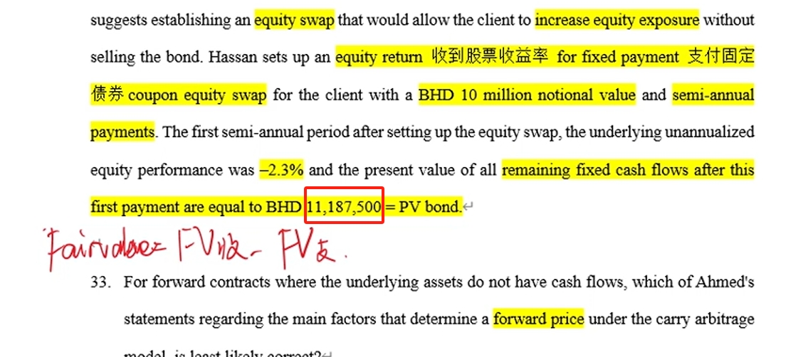 而你提问的这个题目问的是“The fair value (in BHD) of the equity swap”,它是考虑了未来所有现金流的(对应题目给的现值),不能仅仅考虑3.2%/4这一笔现金流