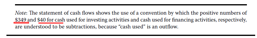 这个题目CF/S的记录现金流的方式确实比较特殊。下面的注释中写了。CFI和CFF部分的现金算出来是正的394和40,但其实它算出来的代表的是cash used,正的对应的反而是现金流出。所以这个(10)和(40)反而是现金流入。