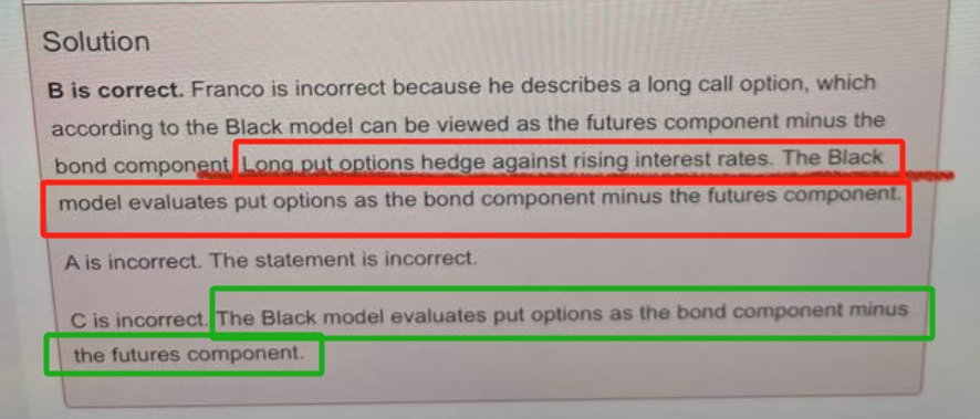 这题为什么选B啊,对冲利率上升的风险不是long call option嘛?为什么这里是long put option