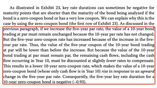 因此就得到了结论:10年期零息票债券(其唯一现金流量在第10年)的价值,随着5年期par rate的向上变化而上升。所以10年期零息债券的KRD5为负数。