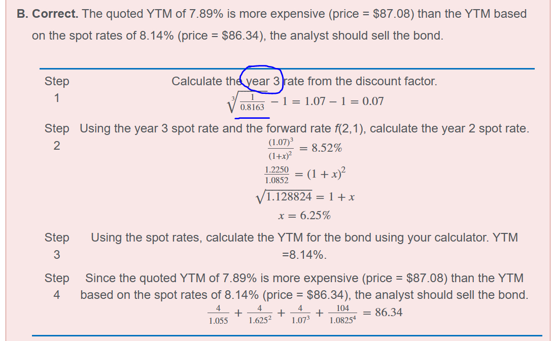 首先就是跟据exhibit 1计算出year 2和year 3的spot rates,然后就正常使用spot rate给债券定价,算出来=86.34;然后现在给到的YTM计算出来的价格=87.08,意味着现在这个债券价格被高估,所以sell