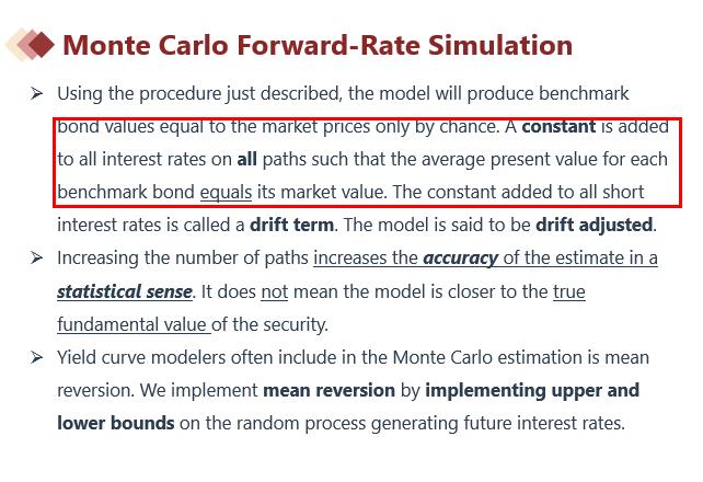 这里是为了用蒙特卡洛模型算出来的Model price 和市场上价格校准。如果理论价格不同于市场价格,在所有利率路径的节点上都增加或减少一个常数,使债券的理论价格能等于其市场价值。这个是构建蒙特卡洛模型的定义概念,见下图讲义