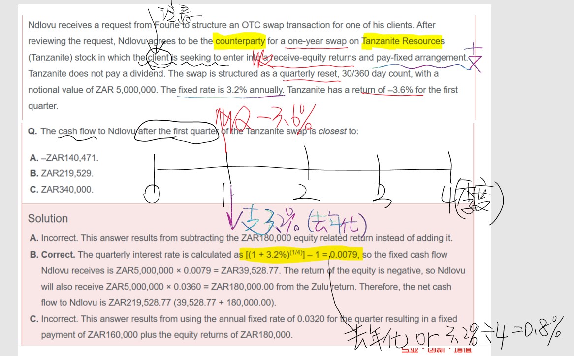 站在题目给的角度,收股票收益率(-3.6%),支出固定收益率(-0.0079),然后求解考虑名义本金即可,不需要折现,就是t=1时间点的现金流