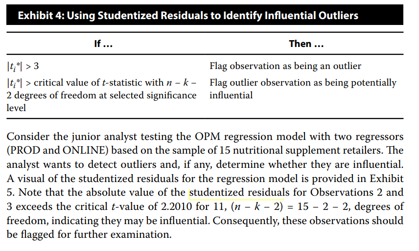 第二题studentized residual用critical t-statistic 2.63,如果critical t-statistic 是大于3,则用3。我想问下和3比较的这个判定,哪里有讲?可以详细说说吗?