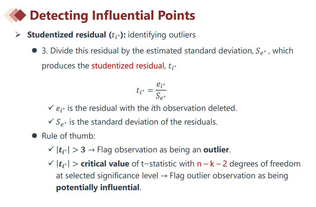 |𝒕𝒊∗| > critical value of t−statistic with n – k – 2→临界值的确定基于期望的显著性水平以及与残差相关联的自由度,残差超过这个临界值的观测被认为具有潜在的影响。