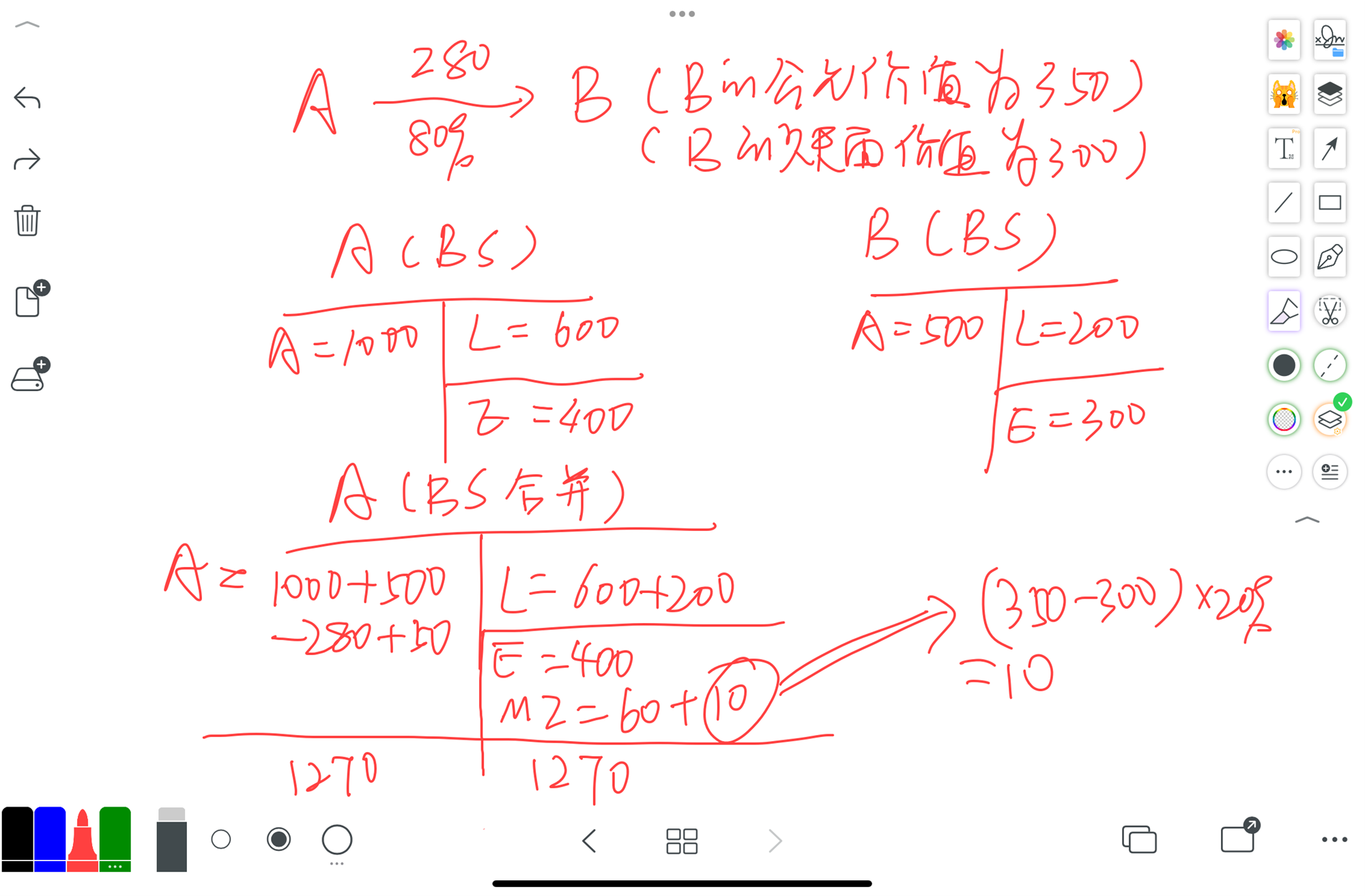 合并后的资产负债表也要满足恒等式,资产=负债+所有者权益,在full goodwill下,左边资产为1270,右边负债(800)+所有者权益(400)+MI(60+10)=1270,此时少数股东也因为商誉而增加了10,具体见下图。
