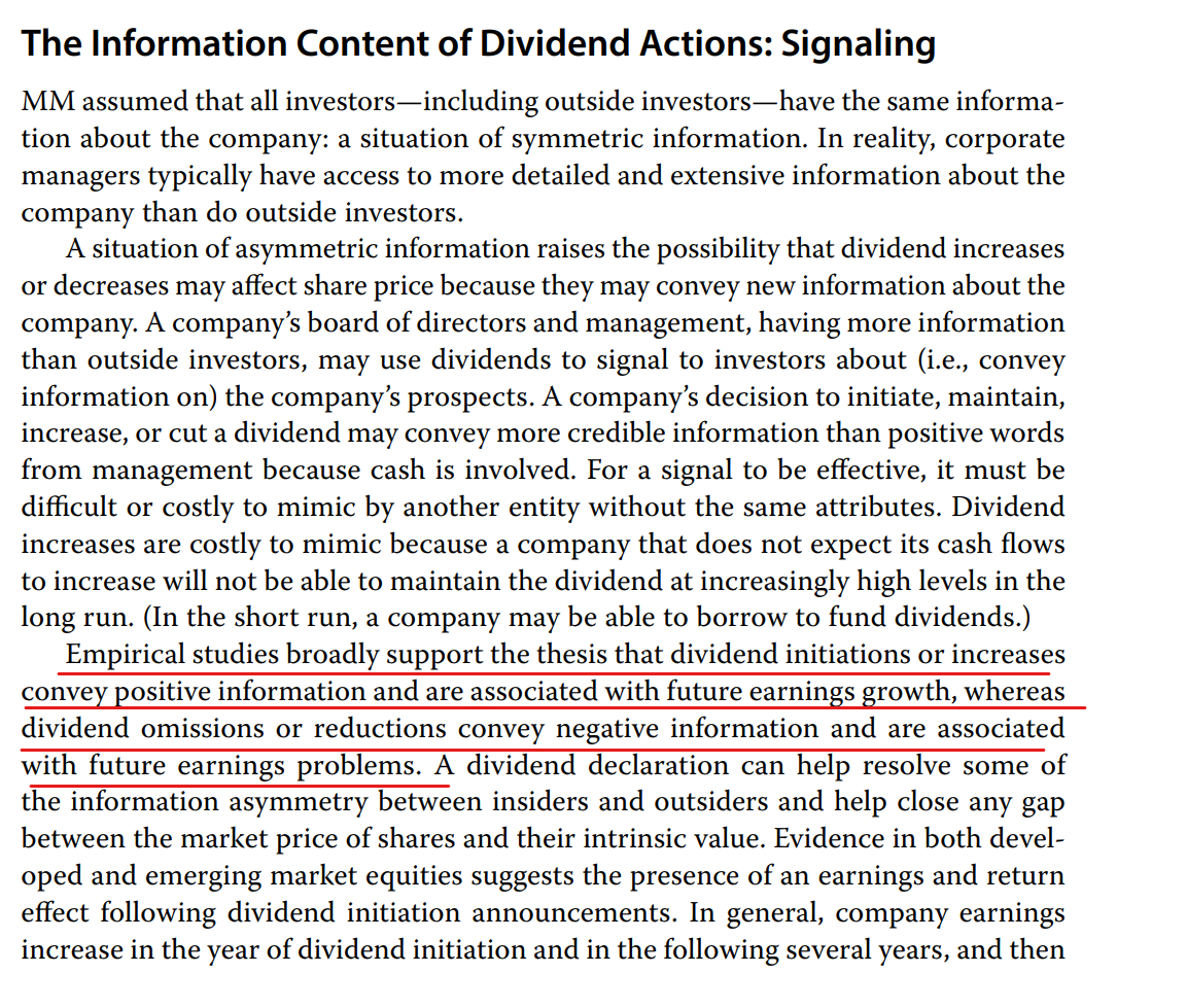 原版书中有写到:dividend initiations 是一个正面的信号,具体的内容截图放下面了。