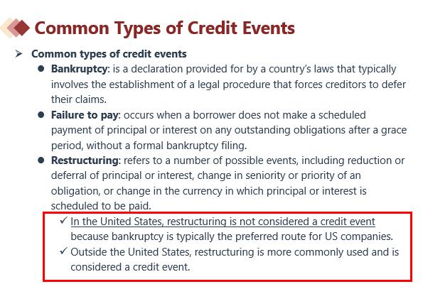 对于公司重组,如果在美国那么不算是credit event,除此之外都算是credit event。