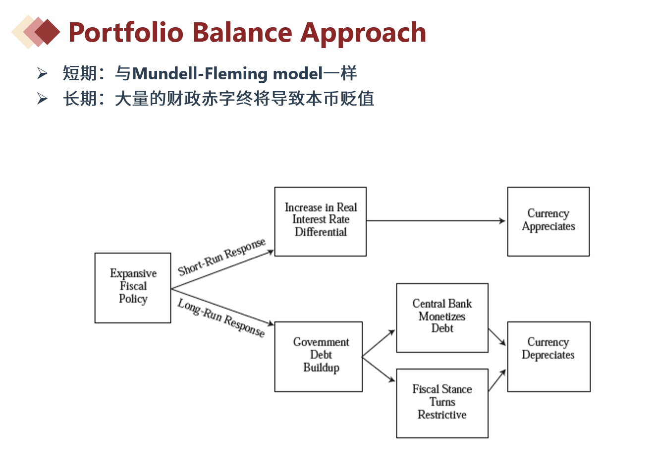 同学你好,可以参考下图,如果是资本流通的情况下,长期影响:扩张的财政政策会导致政府支出增加,税收减少,导致财政赤字,如果政府长期处于财政赤字状态,政府就不得不印钱来还债,多印钱就会导致本币贬值;或者政府由于债台高筑就只能改为紧缩的财政政策,同样导致本币贬值。Portfolio balance approach在短期内是和M-F模型结果一致的,但是在长期就和M-F相反了。