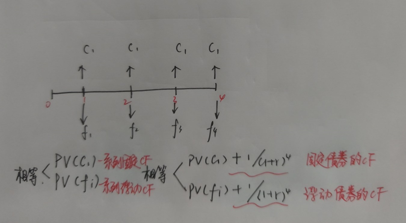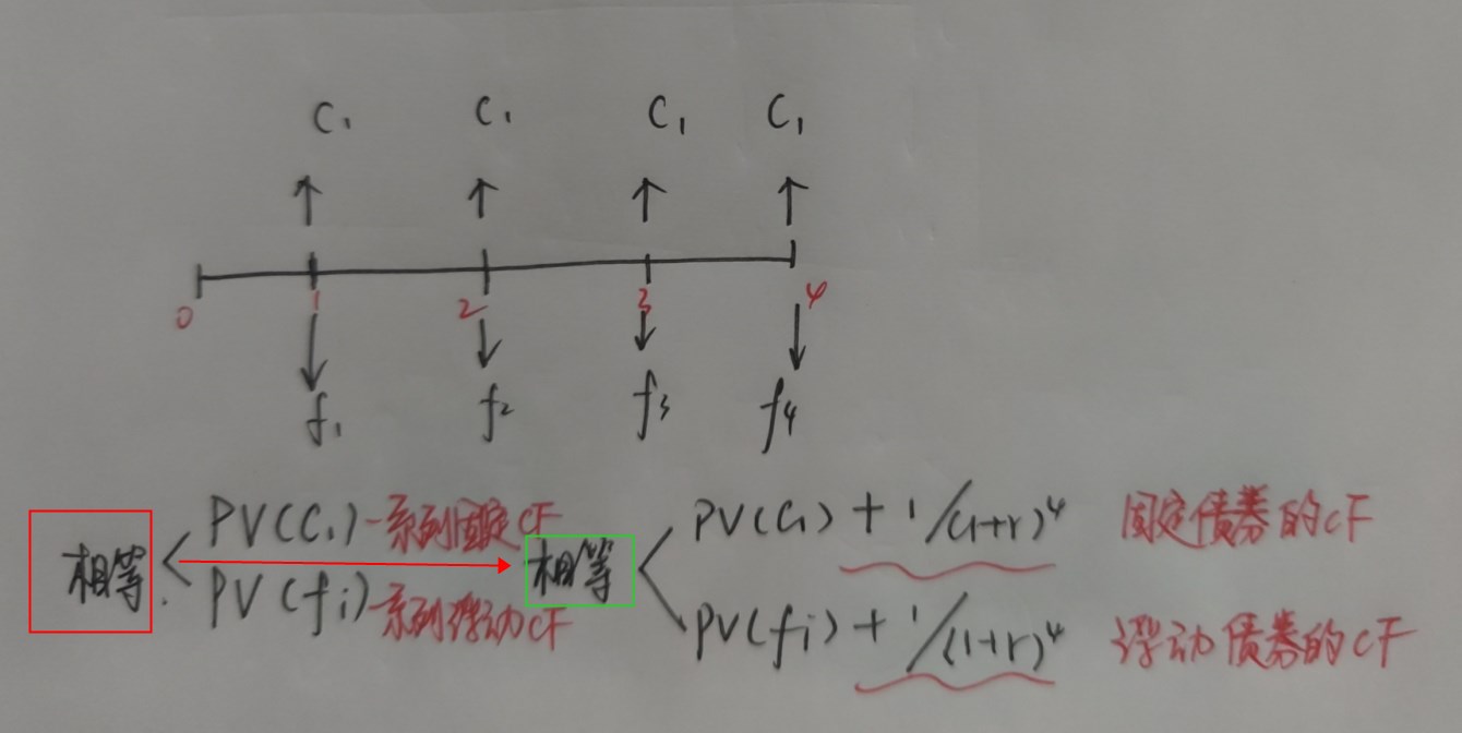 在期初定价的时候,对于浮动利率和固定利率,可以仅仅考虑一系列现金流,也可以再多考虑期末时间点的本金单位1,期初是平等的合约,这一点不会改变
