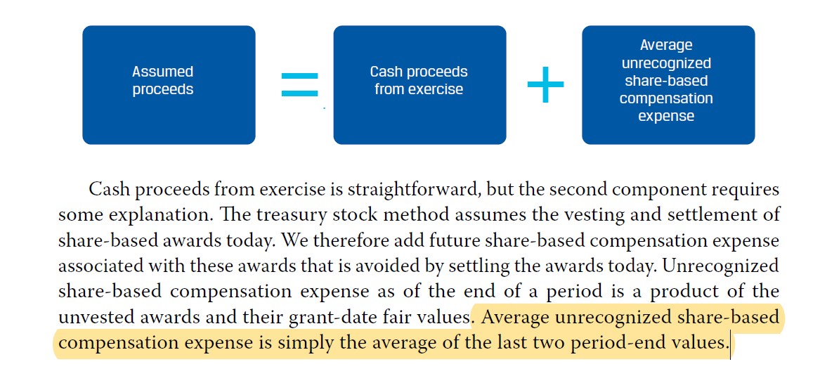 第5题,assumed proceeds是啥意思?包含cash proceeds和unrecognized expense在哪里讲过???unrecognized expense指的是什么,和前面两年的unrecognized expense有什么关系?为什么会有unrecognized expense?无法理解为什么会产生这项expense。