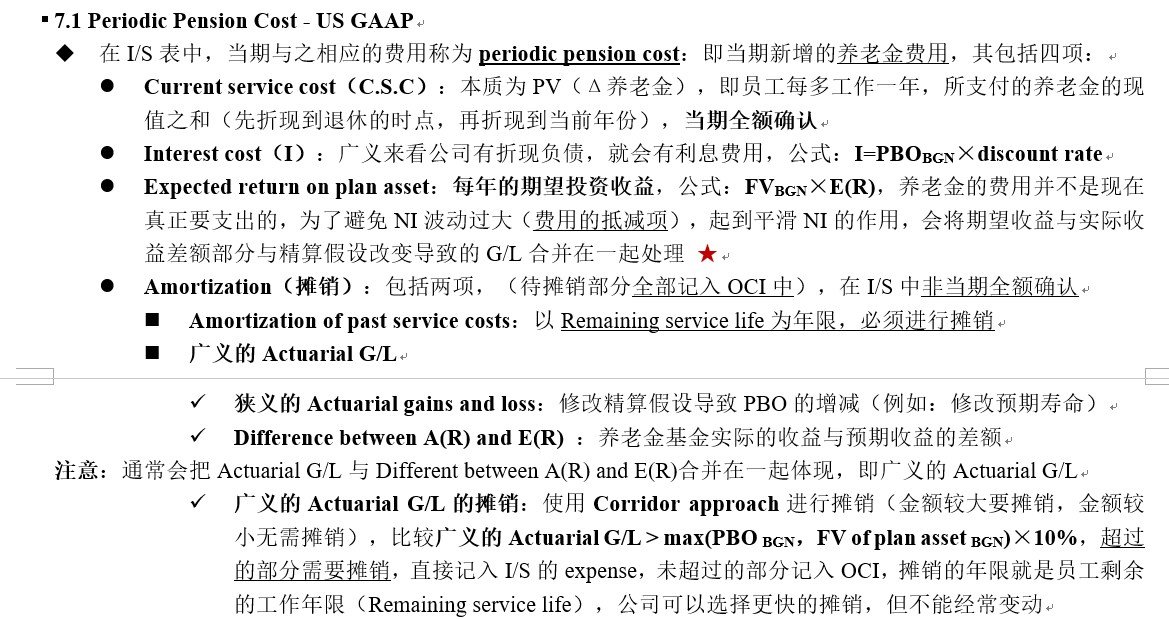 1. 在I/S表中,当期与之相应的费用称为periodic pension cost,即当期新增的养老金费用,美国准则与国际准则见截图。