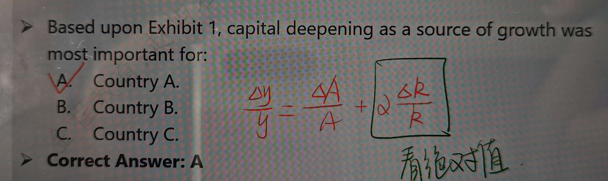 同学你好,题目问的对于哪个国家来说,资本深化对于经济增长的作用最大,绿框里的就是资本深化所带来的经济增长,哪个国家的α×Δk/k最大,就选哪个国家。