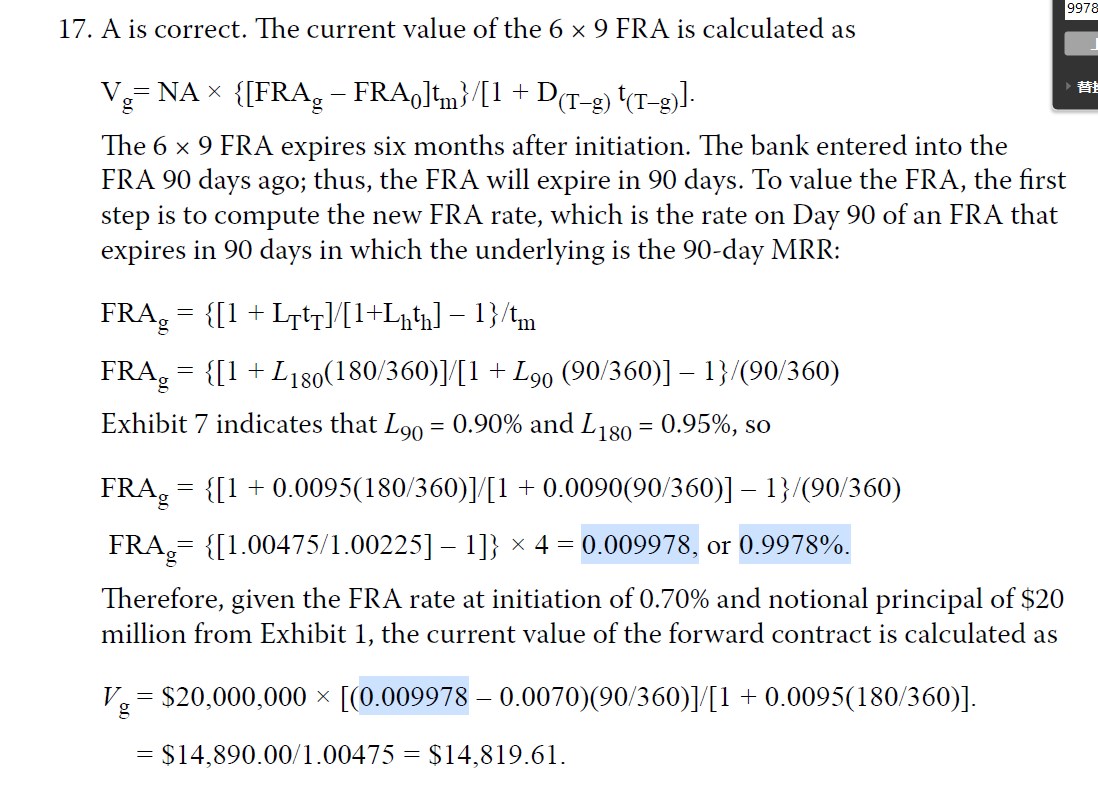 这个题目应该是看标的资产是否涨跌,原来定的标的资产是FRA=0.7%,而新合约定的FRA是0.9978%,于是这份合约是赚的,赚的钱是你提问的截图中对应的计算结果
