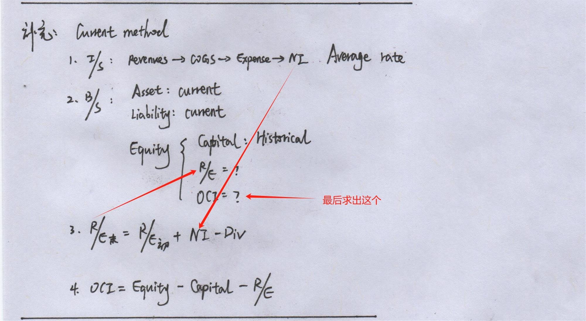 同学,上午好。因为在current method下,用base 法则计算出retained earning,最后把retained earning代入equity中,最后在求出OCI,具体过程见截图。