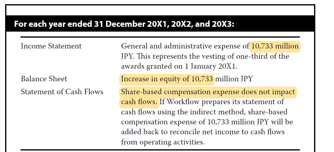 同学,上午好,stock option的exercise日,会有现金流入,报表也会有影响。例子见截图。