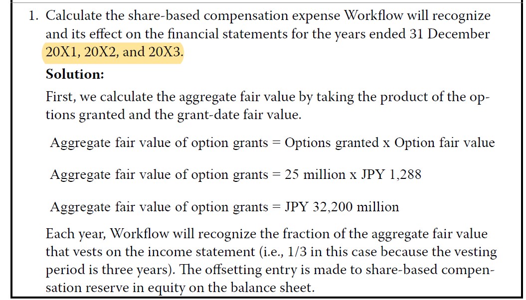 1. vest 确认的是授予日的公允价的平摊,这个example里,期权的公允价是1288,分3年平摊,vest的expense=1288*25/3=10733