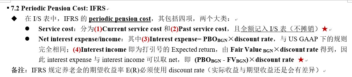 在I/S表中,当期与之相应的费用称为periodic pension cost,即当期新增的养老金费用,以IFRS为例,periodic pension cost有4个见截图。