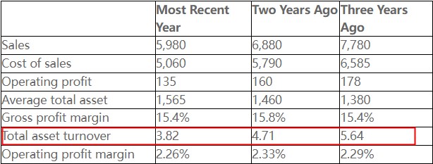 同学,上午好。考察的各种ratio的计算公式,及变化。gross profit margin,operating profit margin,total asset turnover ratio都是越高越好