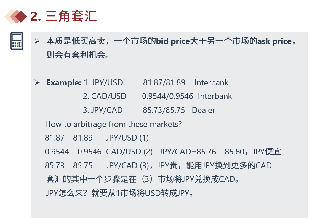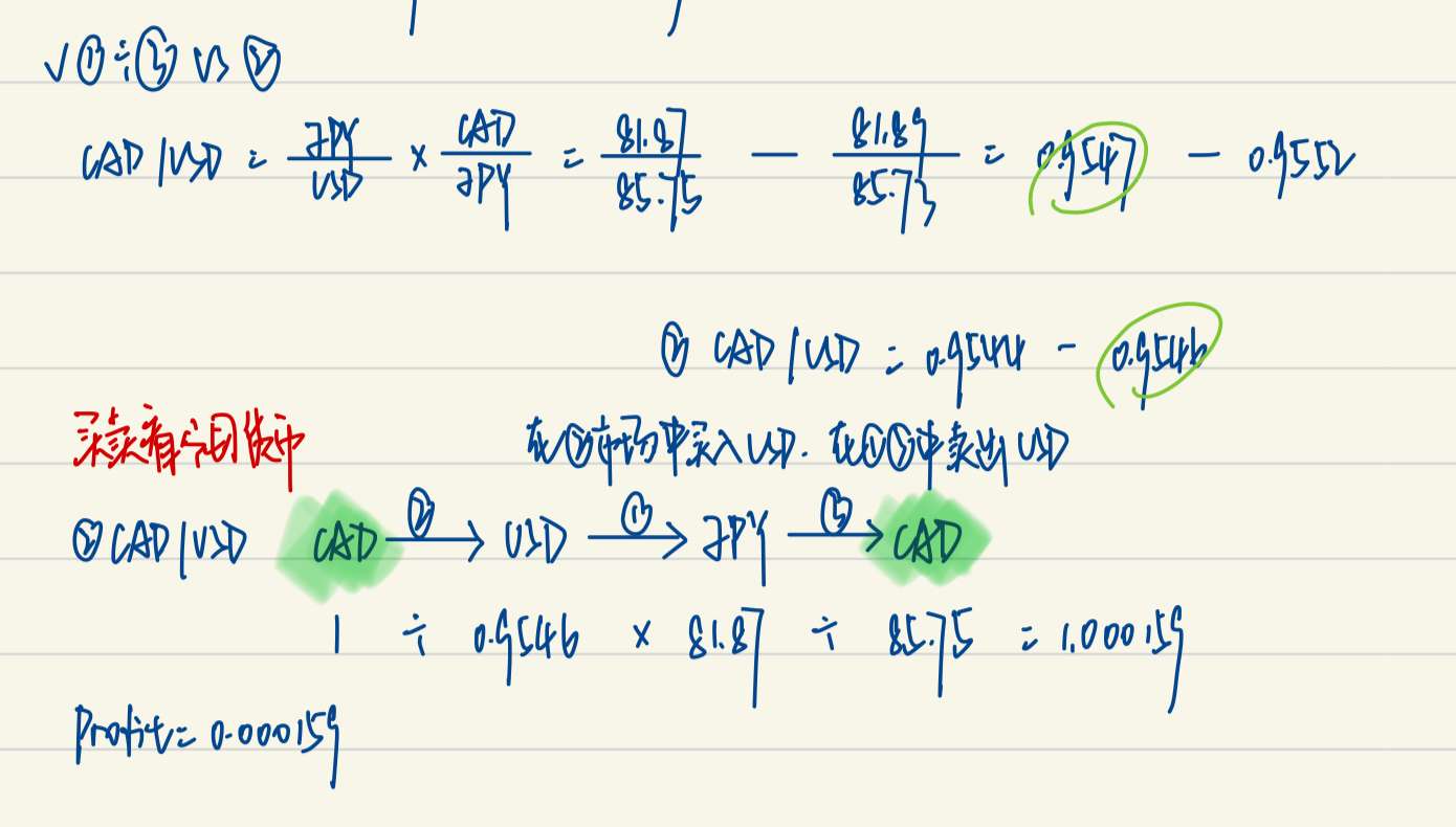 同学你好,假设1和2市场是interbank,3市场是dealer,那么就是按我说的这个路径,现在1市场用1USD换成81.87JPY,然后再3市场把81.87JPY换成0.95475CAD,最后在2市场把0.9547CAD换回1.000159USD,结果是一样的。