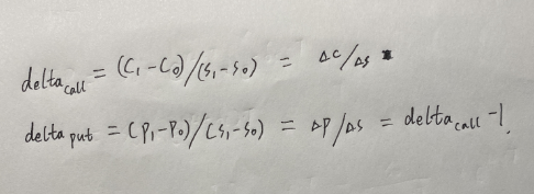 同学,你好。delta受期权价格和股票价格变动的影响,看涨期权的delta=(C1-C0)/(S1-S0).