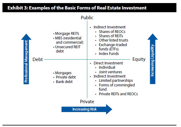 同学你好。private:直接购买物业;public:间接购买物业,例如通过上市股票或REITs等;equity:权益投资者,例如投资上市物业股票或REITs;debt是债务投资者,例如私人债务、按揭抵押等。
